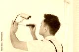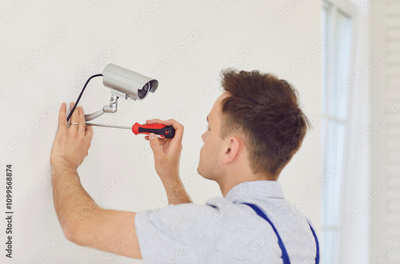 Young technician man in uniform installing surveillance CCTV camera on the wall indoors. Male worker using screwdriver while fixing security camera in modern office or at home. Safety concept.