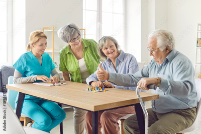 Happy elderly people playing a board game in a nursing home, close-up. Organization of leisure, events and entertainment for older people. Smiling nurse playing with old women and man