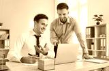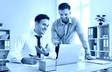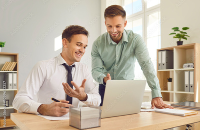 Two smiling confident business people wearing shirts looking at laptop monitor screen at workplace discussing company finance on meeting. Employees and male coworkers working in office.