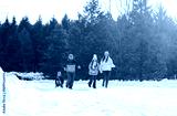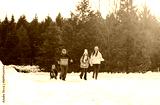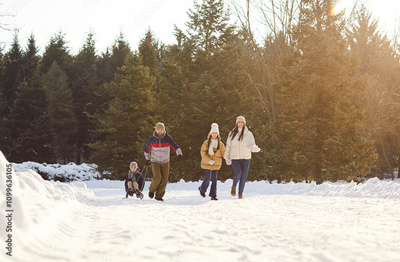 Happy smiling family of four with two kids walking in winter park enjoying beautiful nature. Young parents sledding their son outdoors enjoying time together. Family leisure concept.