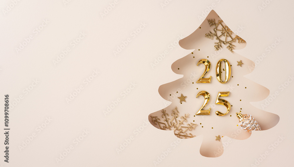 A top view minimalist Christmas tree silhouette featuring elegant golden 2025 numbers and festive decorations creating a luxurious holiday atmosphere