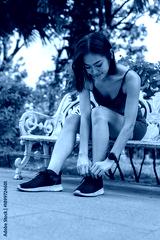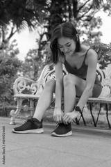 Shot of outdoors women with smartwatch it tying shoelaces active exercise ready to running the garden healthy. Active young female sitting chair tying shoe before jogging in park.