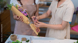 A florist teaching her colleague to wrap a bouquet, showcasing guidance and collaboration in a flower shop filled with blooms
