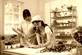 A florist carefully wrapping a flower bouquet while another florist observes, in a flower shop filled with vibrant plants and tools