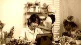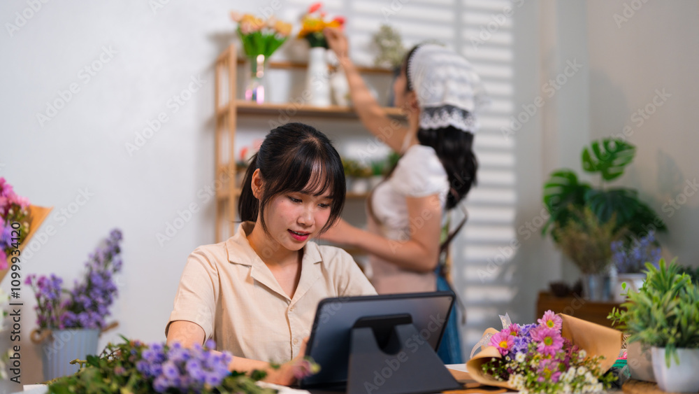 A florist taking orders on a tablet in a flower shop surrounded by colorful flowers and bouquets, with a colleague arranging flowers in the background