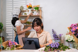 A florist taking orders on a tablet in a flower shop surrounded by colorful flowers and bouquets, with a colleague arranging flowers in the background