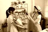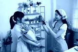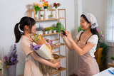 A florist taking a photo of a bouquet while another florist admires the creation, showcasing teamwork in a lively flower shop