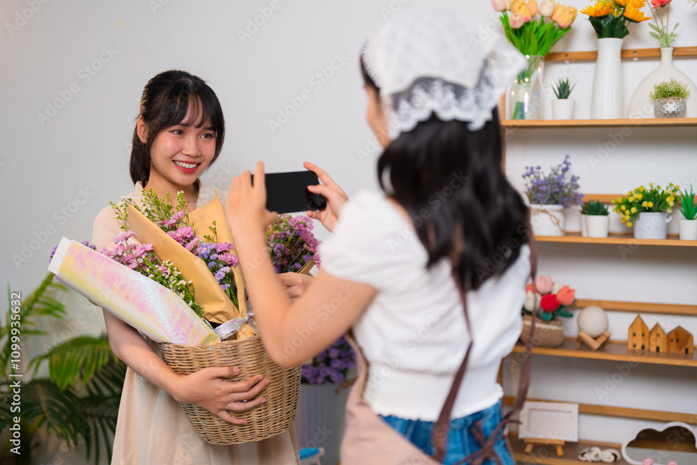 A florist taking a photo of a bouquet while another florist admires the creation, showcasing teamwork in a lively flower shop