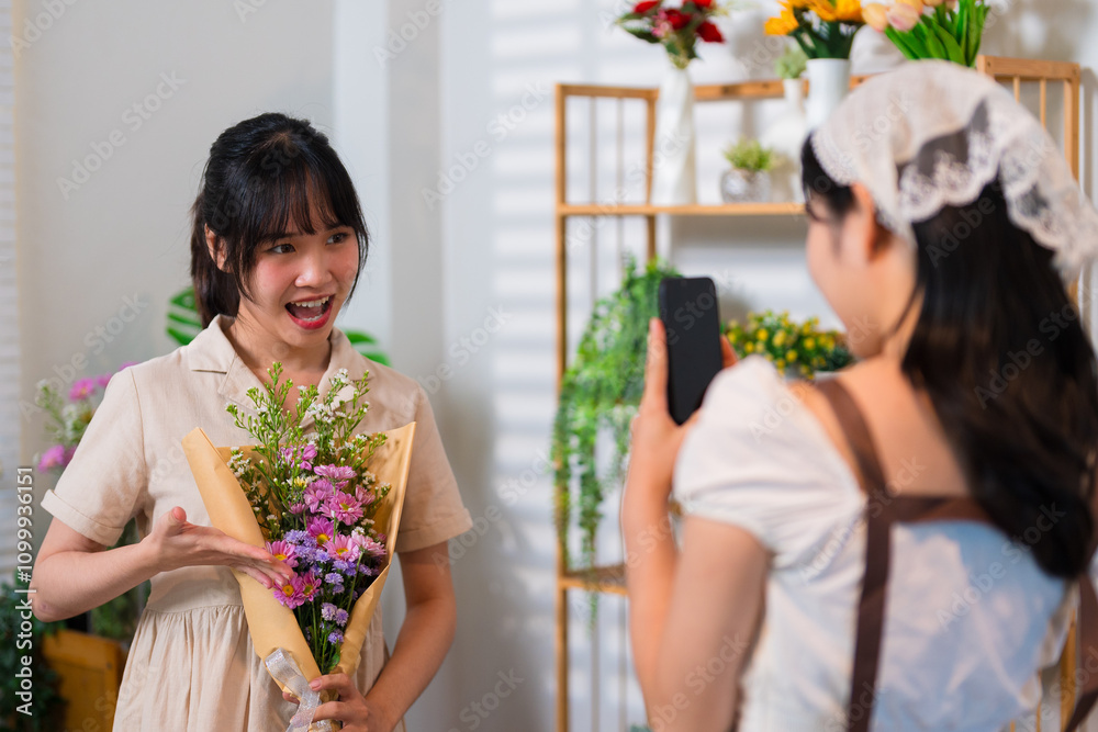 A florist taking a photo of a bouquet while another florist admires the creation, showcasing teamwork in a lively flower shop