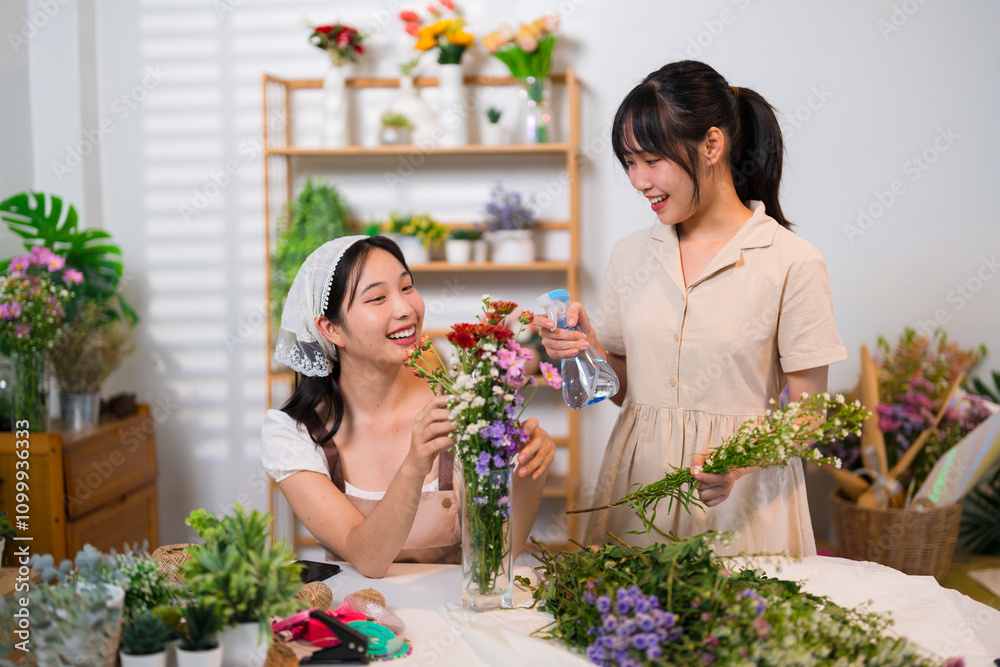 A florist watering flowers with a spray bottle, carefully tending to plants in a cozy flower shop.