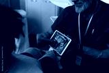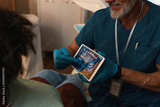 Doctor holding digital tablet showing medical images during patient consultation in clinic setting explaining diagnosis planning next steps ensuring patient understanding