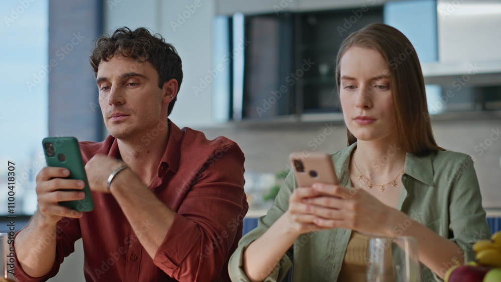 Young pair focused mobile phones at domestic breakfast in apartment closeup.