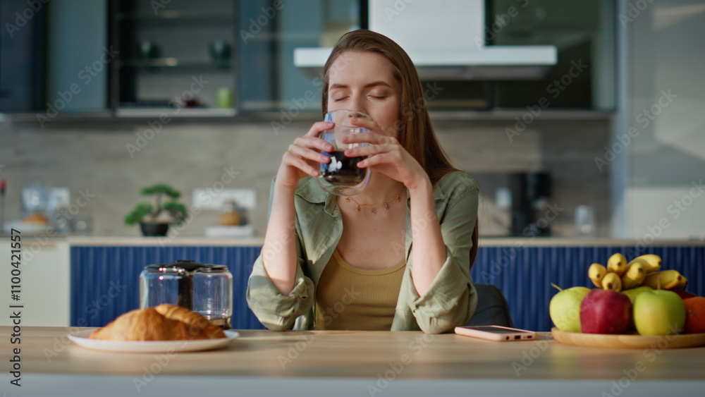 Peaceful woman enjoying coffee sitting apartment kitchen closeup. Relaxed lady
