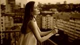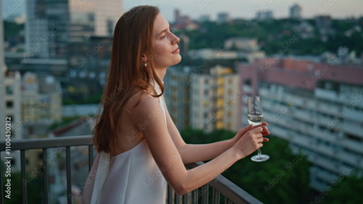 Elegant dressed woman standing on balcony enjoying peaceful evening closeup.