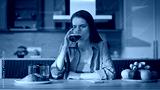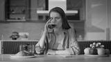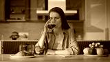 Home woman sipping coffee at breakfast receiving cellphone message closeup.