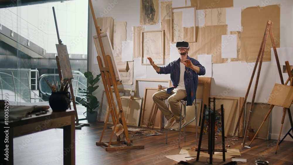 An Artist Uses VR to Immerse Himself in a Virtual Studio, Creating and Exploring New Artistic Worlds. Combines Traditional Art Techniques with Modern Digital Tools in an Innovative Virtual Environment
