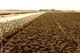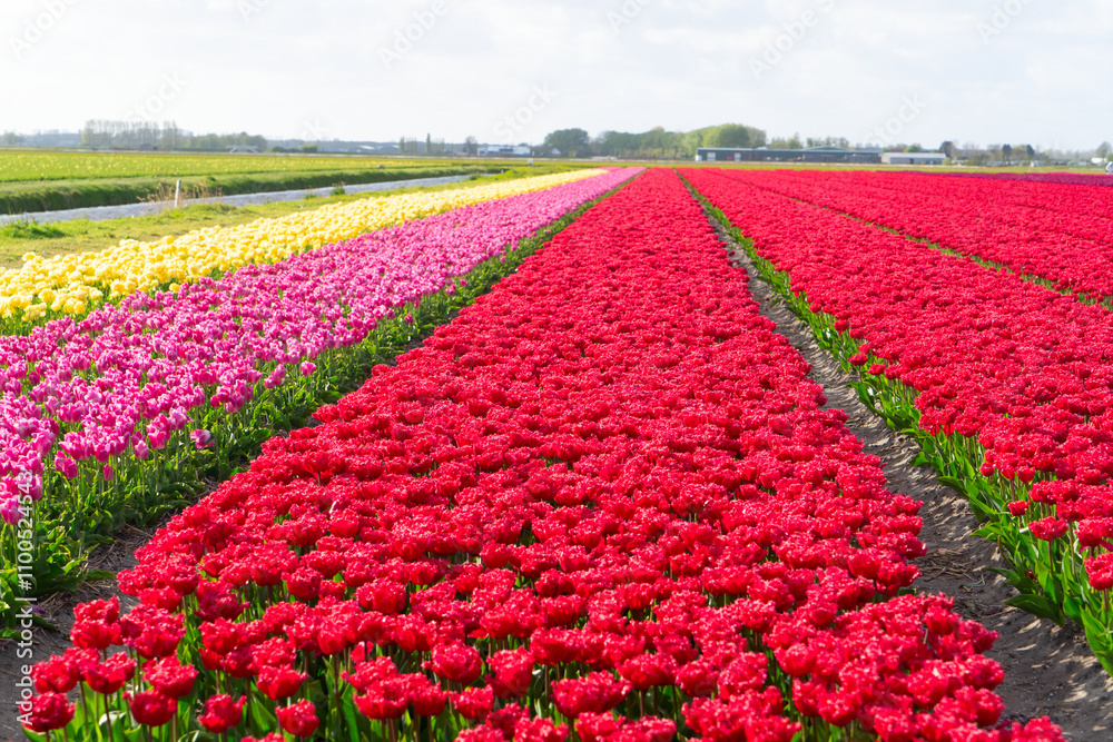 Famouse dutch red tulip field with rows in sunny day with blue sky