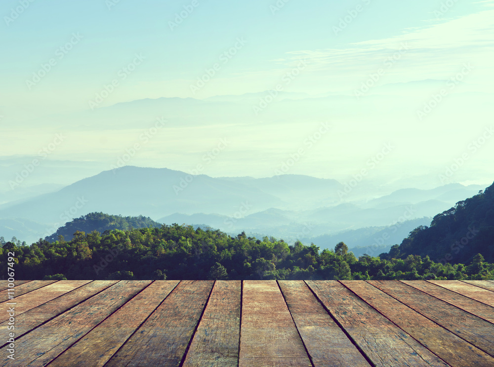 Wood terrace with perspective view on mountain hills and mist. Vintage style.