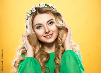 Beautiful Spa model Girl with Perfect Fresh Clean Skin. blond girl holding hands near the hair.