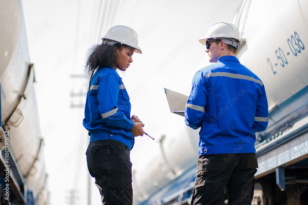Team of engineer railway wearing safety uniform and helmet under checking train ,wheels and control system for safety transportation. Maintenance cycle concept.