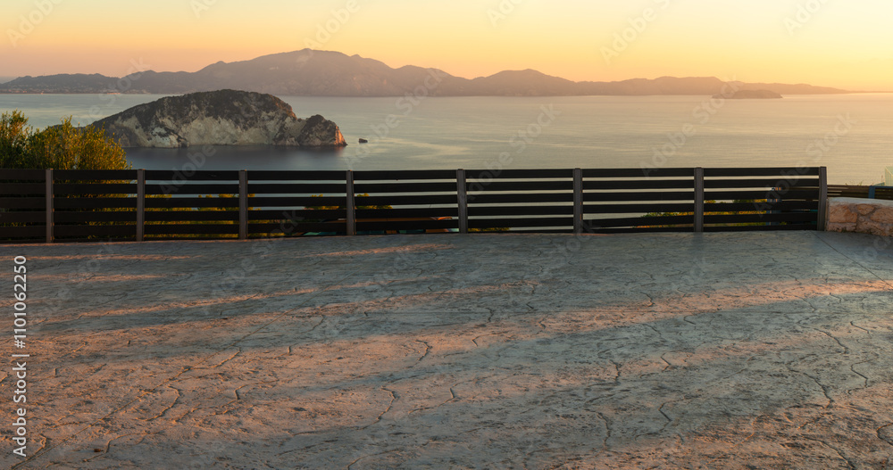 cgi backplate production.Concrete parking lot with railings and view of islands and sea