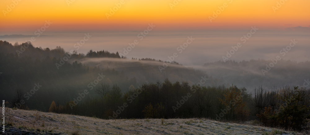 Frosty and misty sunrise in the autumn mountains of southern Poland