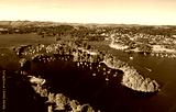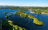 Windermere in the Lake District National Park, Cumbria, England. Aerial vista N.E. over lake centre at Bowness marinas and Belle Isle. Summer evening