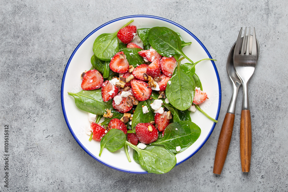 Light Healthy Summer Salad with fresh Strawberries, Spinach, Cream Cheese and Walnuts on White Ceramic Plate, Grey rustic stone Background Top View.