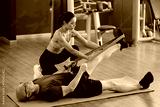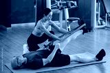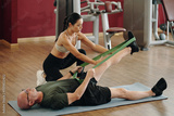 Trainer assisting an elderly man with stretching exercise using resistance band in gym. Man lying on mat, trainer kneeling beside, and gym equipment visible in background