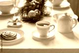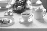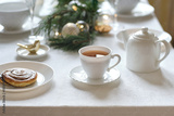 White cup of tea on Christmas celebration dinner table on the white linen cloth.