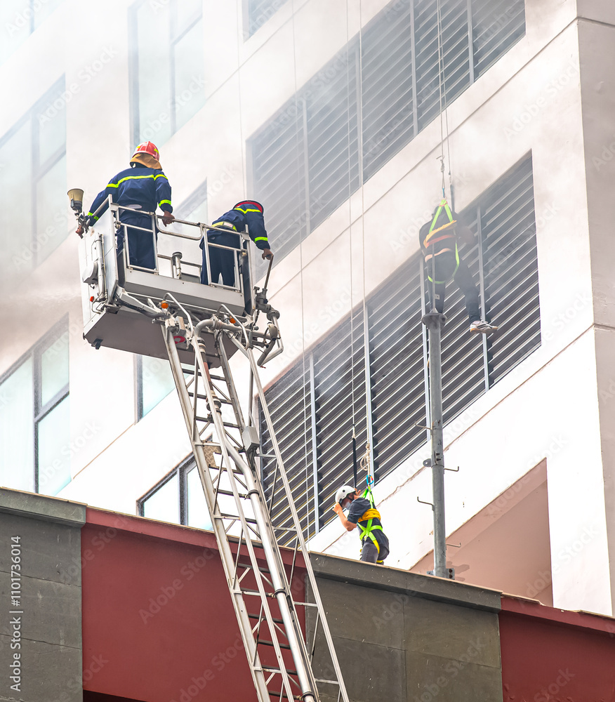 Firefighters during a rescue operation. A fire engine spraying water with a high ladder and a fire hose onto the smoke-filled roof of a burning building. firefighters on the stairs extinguish the fire