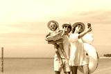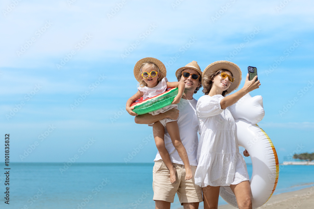Family happy walking selfie photo with camera smartphone on beach children mother father travel summer vacation together sea holiday tropical. Trip enjoying bonding..