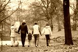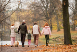 large family with many children walks together hand in hand through an autumn city park.