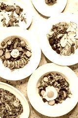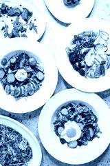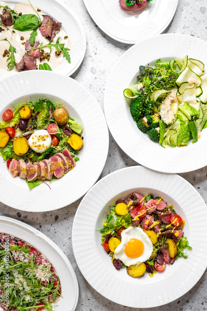 A vibrant assortment of gourmet salads arranged in elegant white plates. Each dish features fresh vegetables, proteins, and a beautifully cooked egg, showcasing a healthy and colorful meal display.