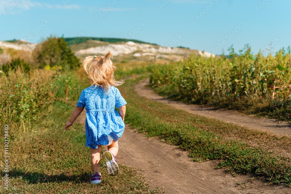 Cute little girl toddler in a dress walks on hills and paths. The concept of tourism with children, family travel. Hilly landscape with green meadows. Amazing view of rural scenery