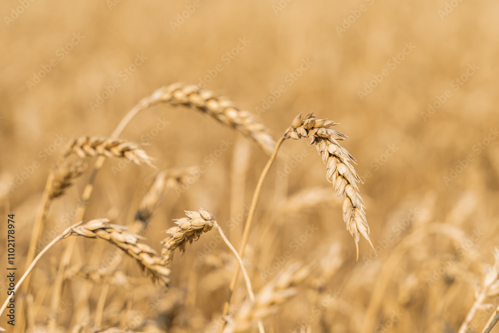 Golden ears of wheat, beautiful agro natural background. Growth nature harvest. Wheat field natural product.