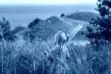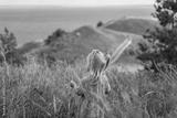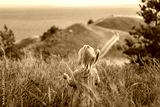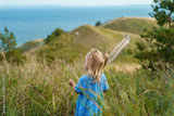 Cute little girl toddler in a dress walks on hills and paths. The concept of tourism with children, family travel. Hilly landscape with green meadows. Amazing view of rural scenery