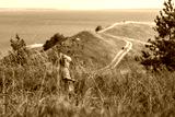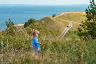 Cute little girl toddler in a dress walks on hills and paths. The concept of tourism with children, family travel. Hilly landscape with green meadows. Amazing view of rural scenery