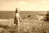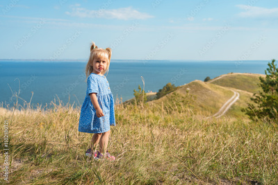 Cute little girl toddler in a dress walks on hills and paths. The concept of tourism with children, family travel. Hilly landscape with green meadows. Amazing view of rural scenery