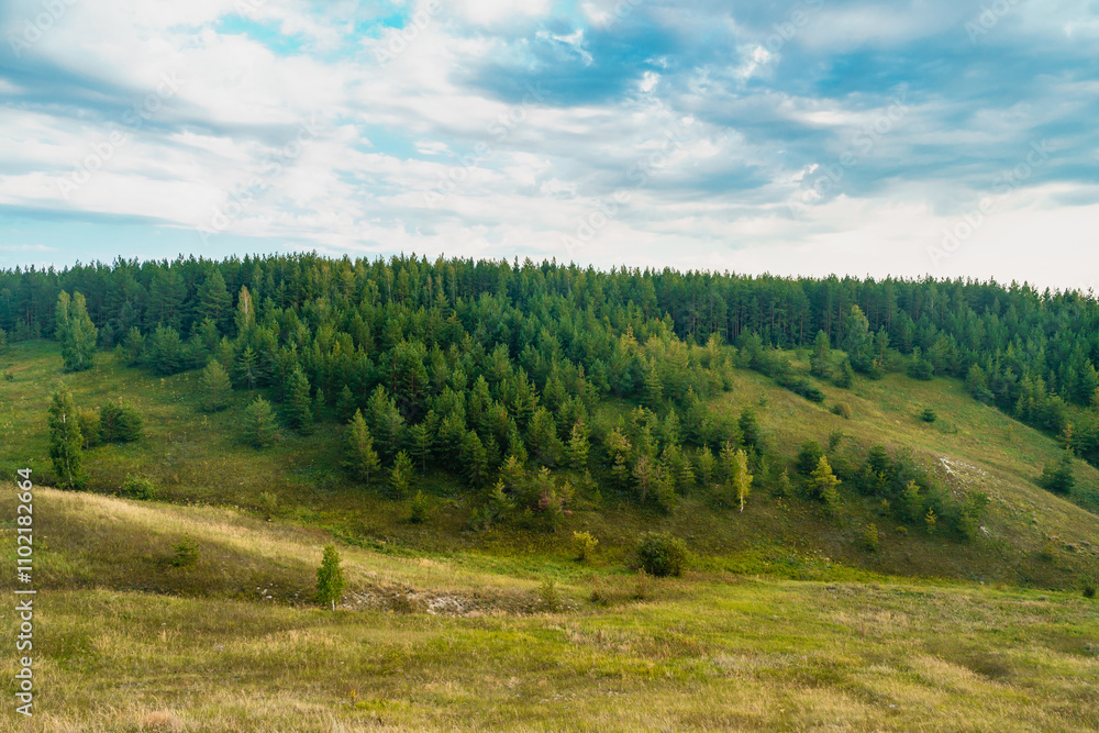 Hilly landscape with green meadows. Amazing view of rural scenery