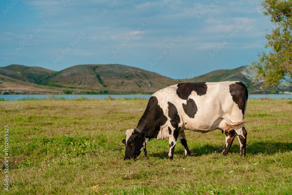 A black and white cow grazes in a green meadow with a beautiful view of the mountains.