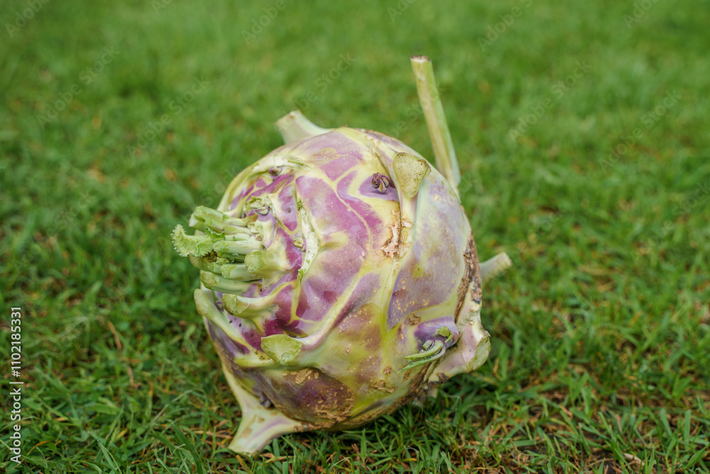 Kohlrabi cabbage lies on the grass, the harvest of summer.