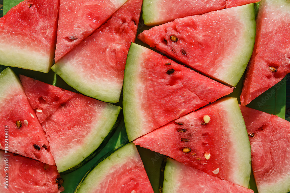 Fresh and Juicy Triangular slices of watermelon lie in the same background.