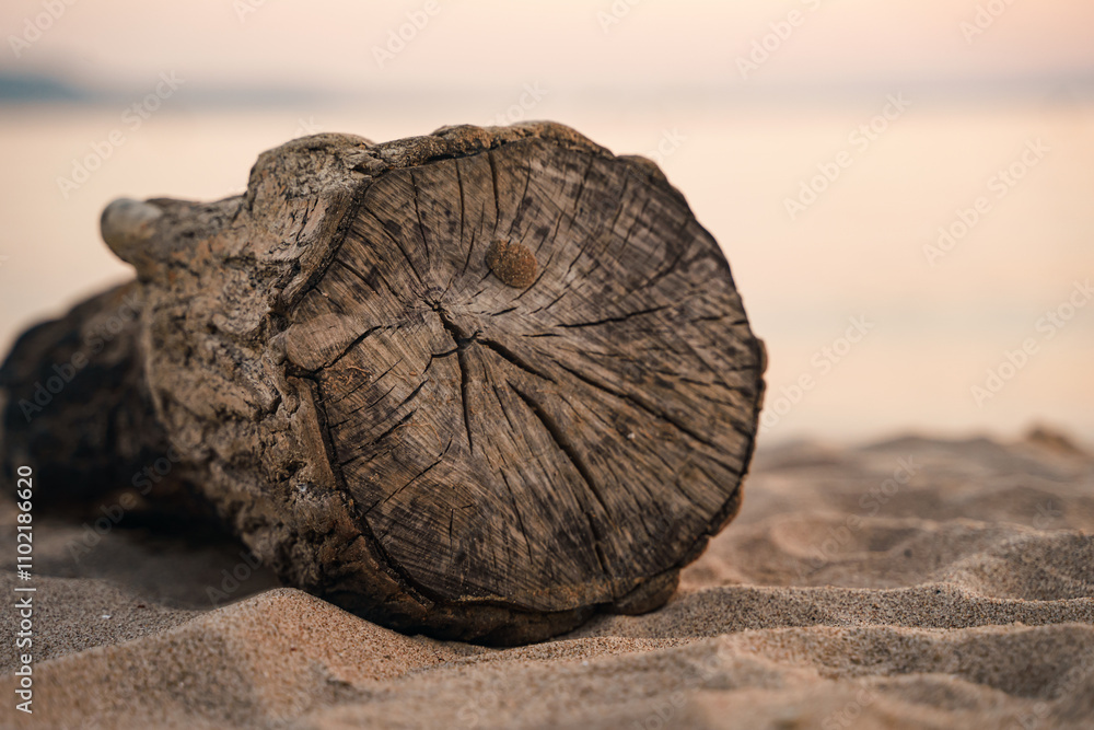 A log on the sand by the sea in the evening.