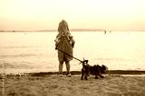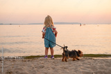 Little girl child outside on the sand beach walks with a Yorkshire terrier dog in the summer in evening.