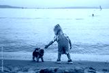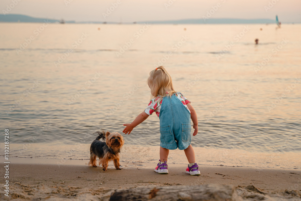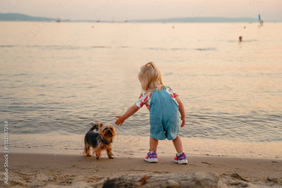 Little girl child outside on the sand beach walks with a Yorkshire terrier dog in the summer in evening.