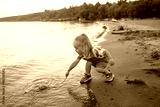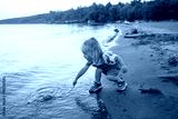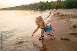 Cute child toddler girl in a denim jumpsuit walks along the beach on the sand in the evening. Happy children's vacation.