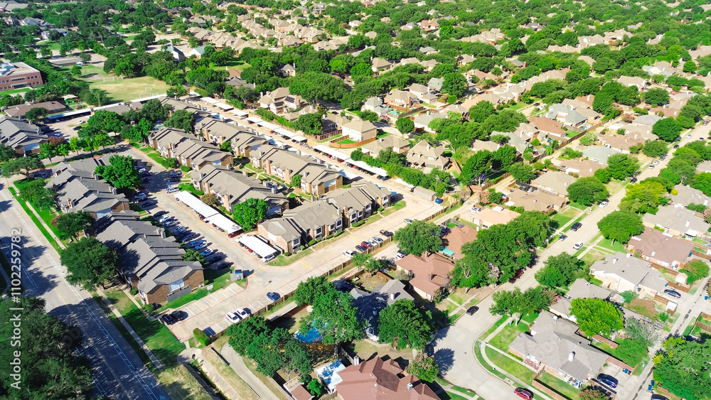 Suburban apartment complex, residential houses upscale community in Coppell suburbs Dallas, Texas, tree lined residential street, row of single-family houses, fast growing housing market, aerial