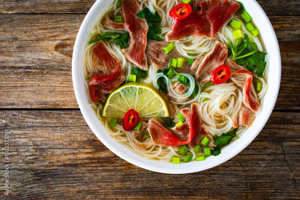Pho soup - Vietnamese soup with beef on wooden table