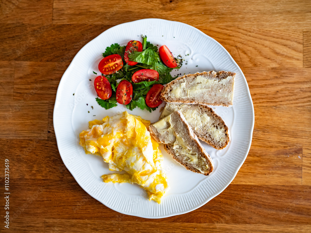 Continental breakfast - scrambled eggs, slice of bread with butter and fresh vegetables on wooden table